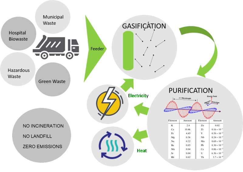 Produces green electricity, heat, and valuable metallic compounds.
